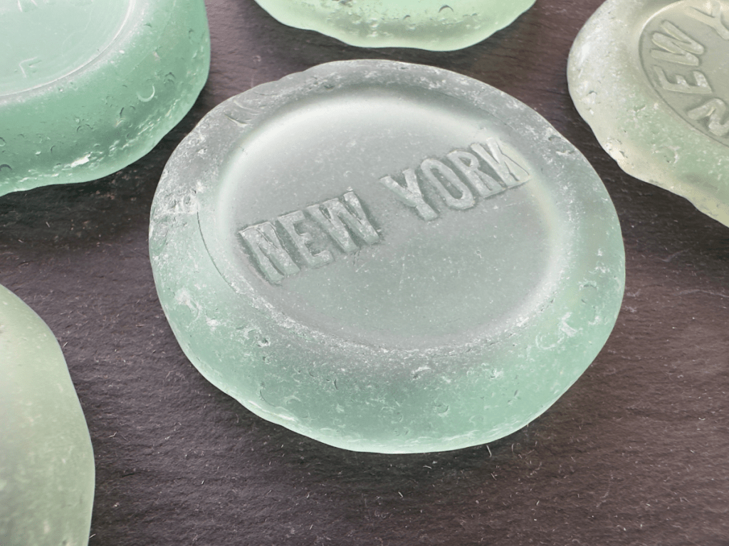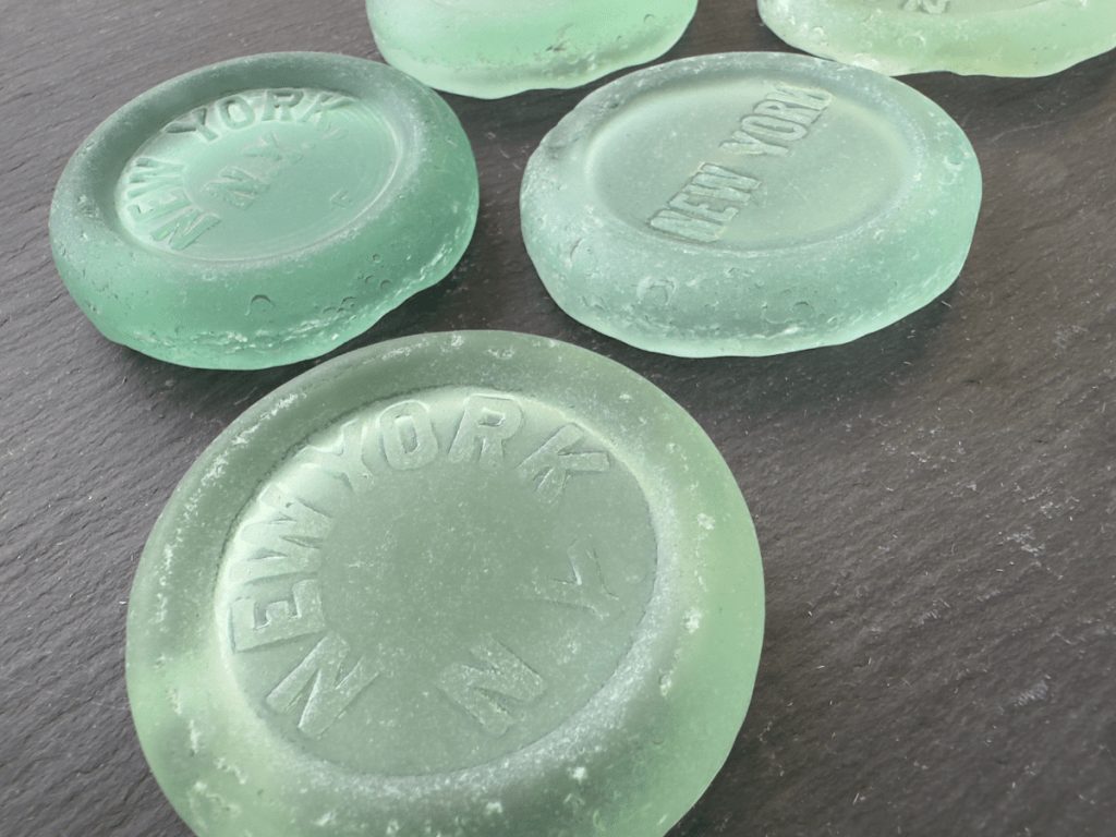 Today, I find myself playing a grown-up version of that very same game. Instead of collecting full bottles from different towns, I’m rummaging through old dumps, beaches, and forgotten corners of New York, unearthing fragments of glass – many bottle bottoms – that tell their own stories. Some are “halfsies,” as I like to call them: pieces already tumbled halfway by the sea, softened but not finished. I put them through my own machine tumbler to complete the work nature started, giving them that smooth, frosted look that makes them feel timeless.