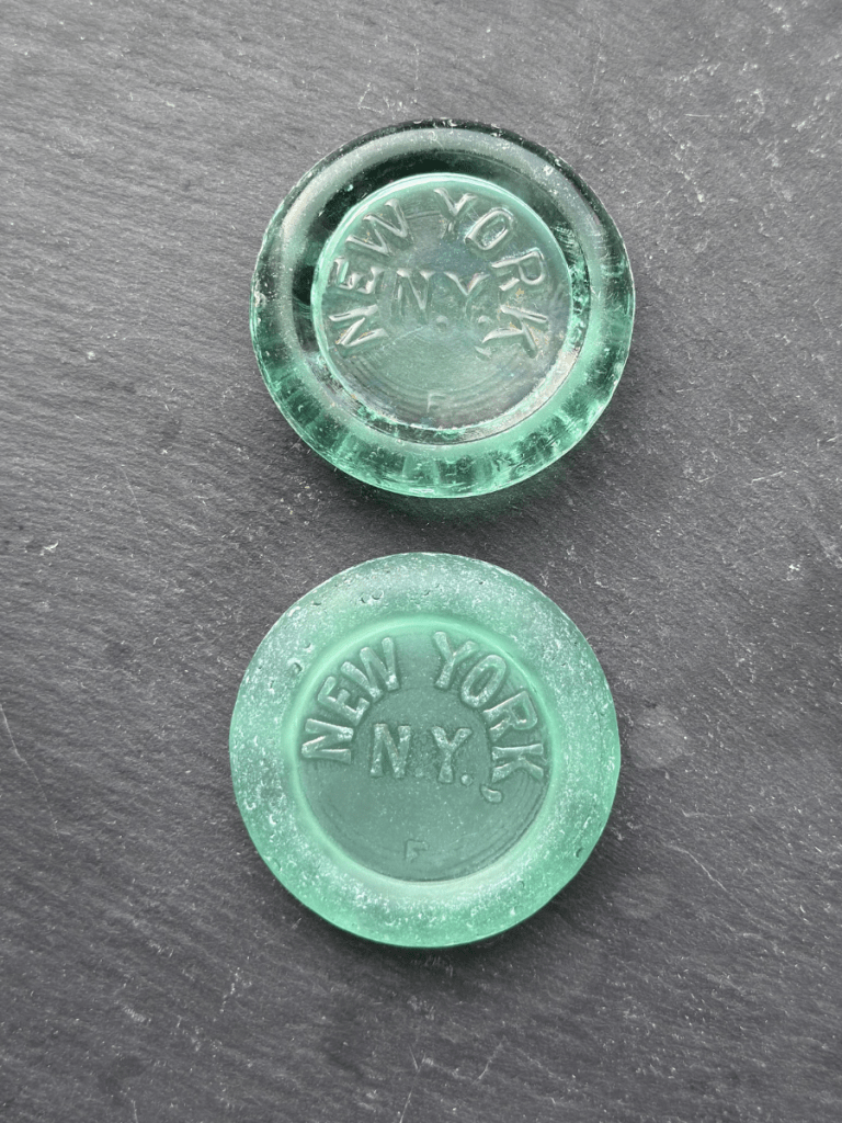 But then there’s the mystery piece. Same aqua-green color, same New York embossing, but no date. I study it, compare it, and wonder: is it early 40’s? It’s the thrill of the game. The unanswered question keeps me digging, keeps me searching for the complete version of the bottle this belonged to.